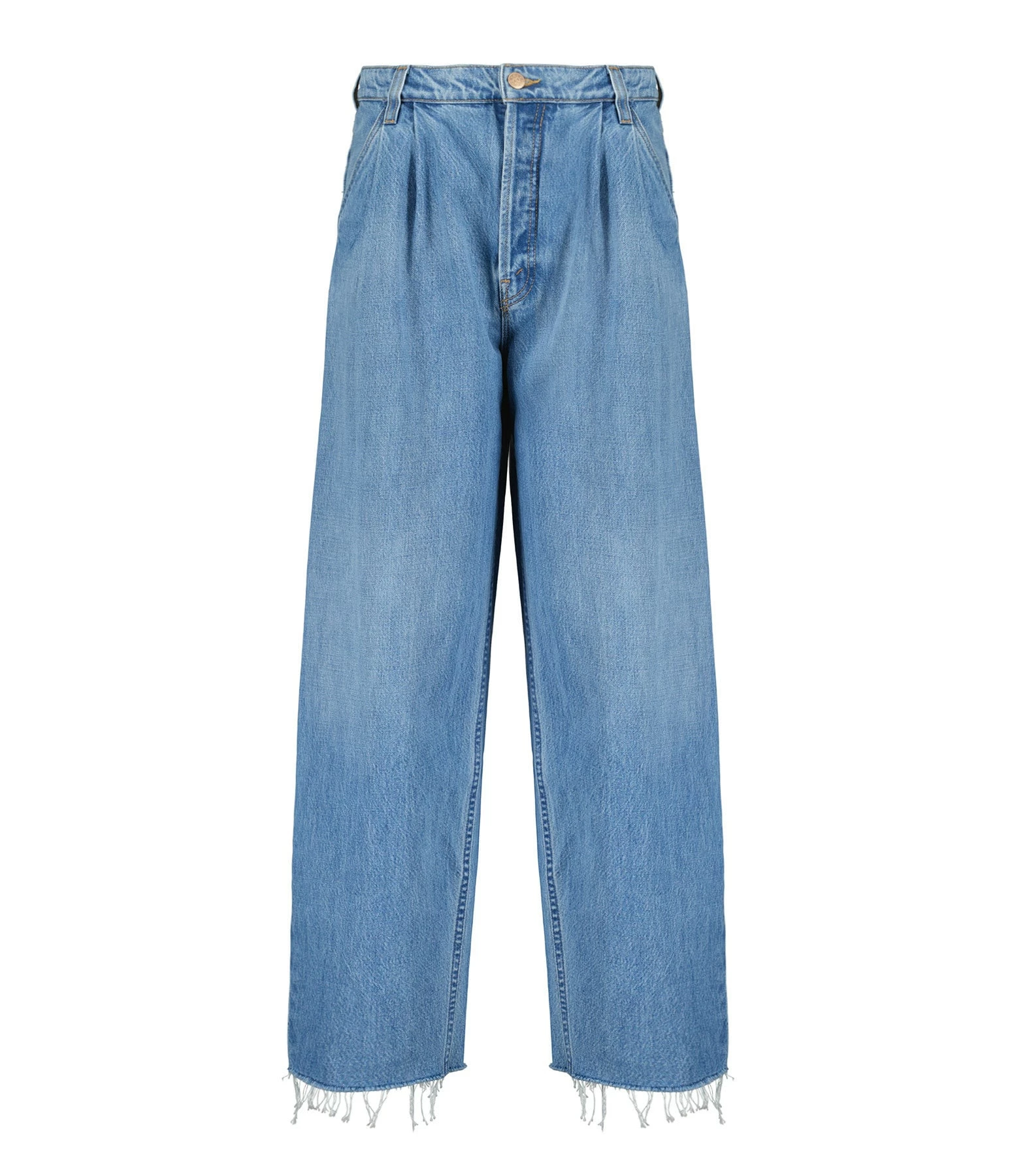 Jean en denim de coton bleu. Taille basse avec passants pour ceinture. Fermeture boutonnée sur le devant. Boutons métalliques roses dorés. Deux poches italiennes. Deux poches plaques dans le dos. Jacron dans le dos. Coupe ample. Base effilochées.