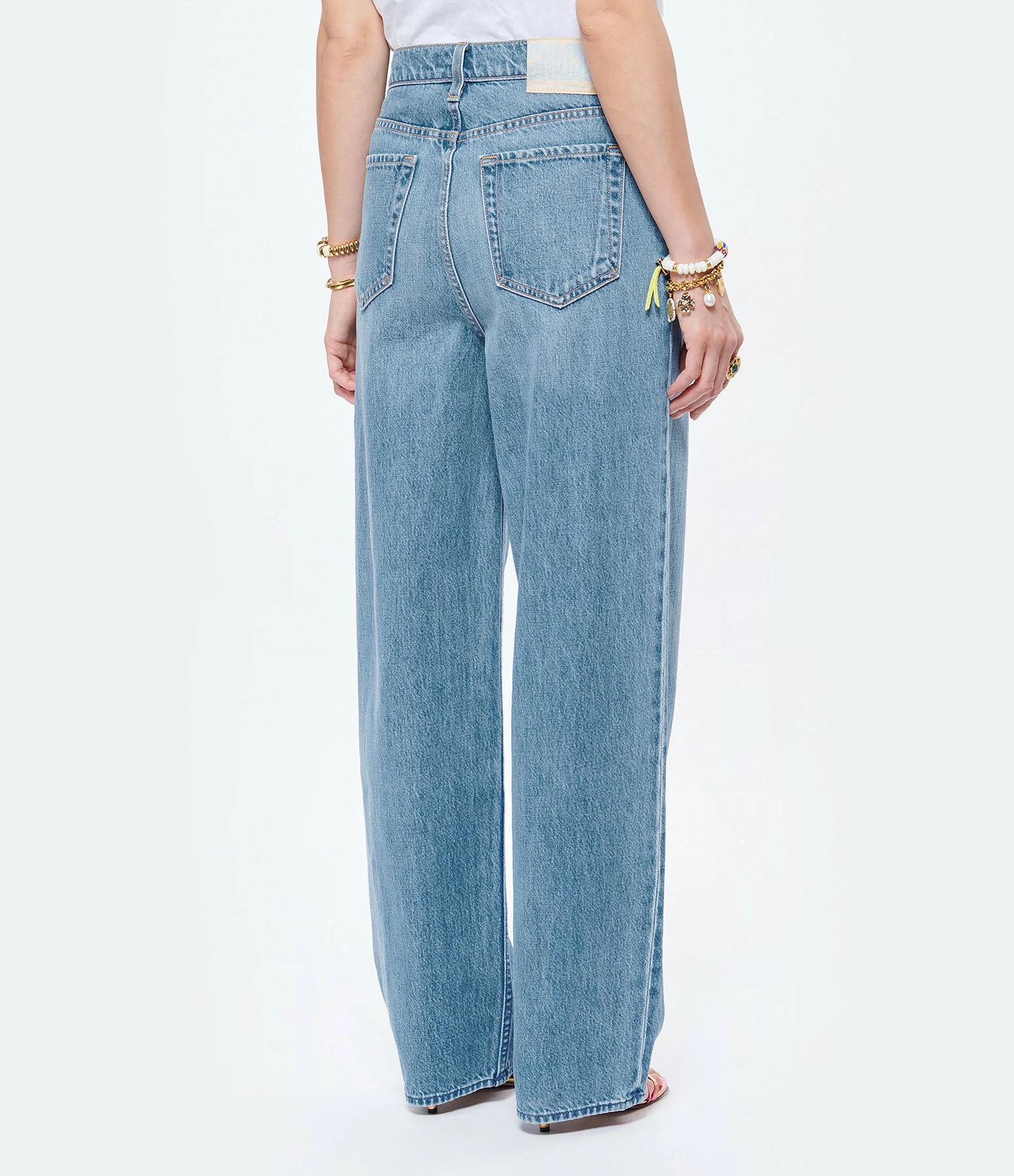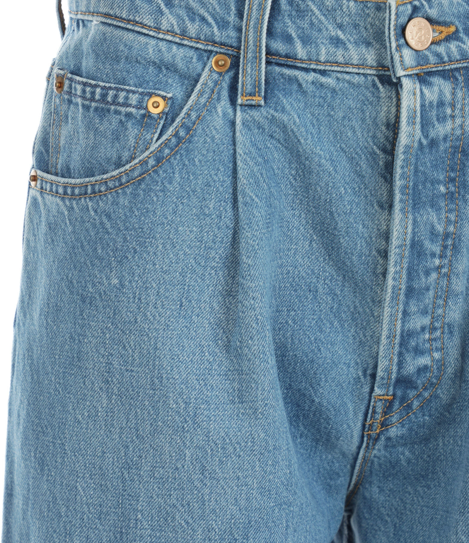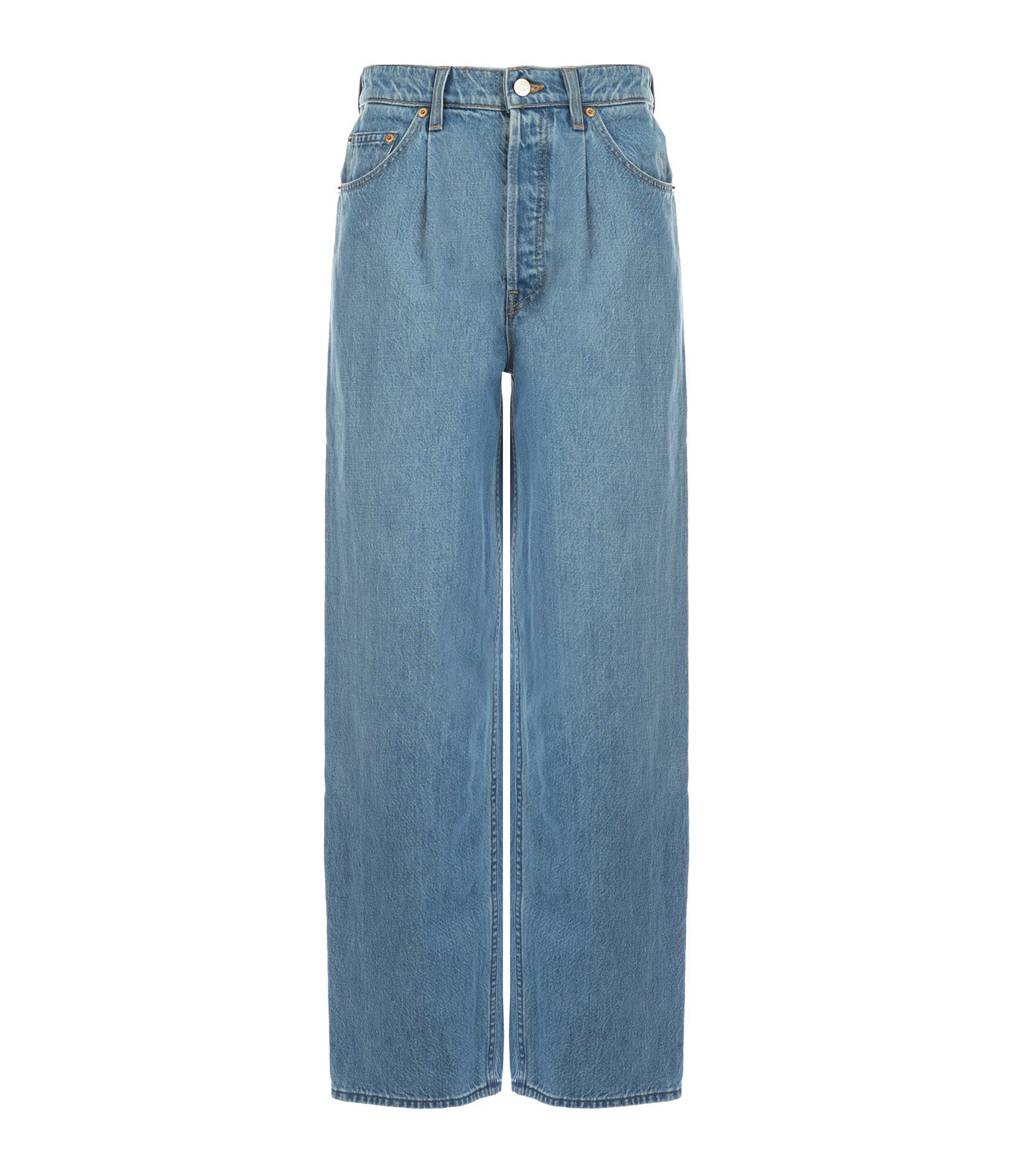 Jean en denim bleu. Jambe large et droite. Fermeture boutonnée. Quatre poches. Plis au niveau de la taille.