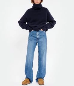 Pantalon droit en lin et soie bleu marine. Deux poches à l’arrière. Fermeture par zip.