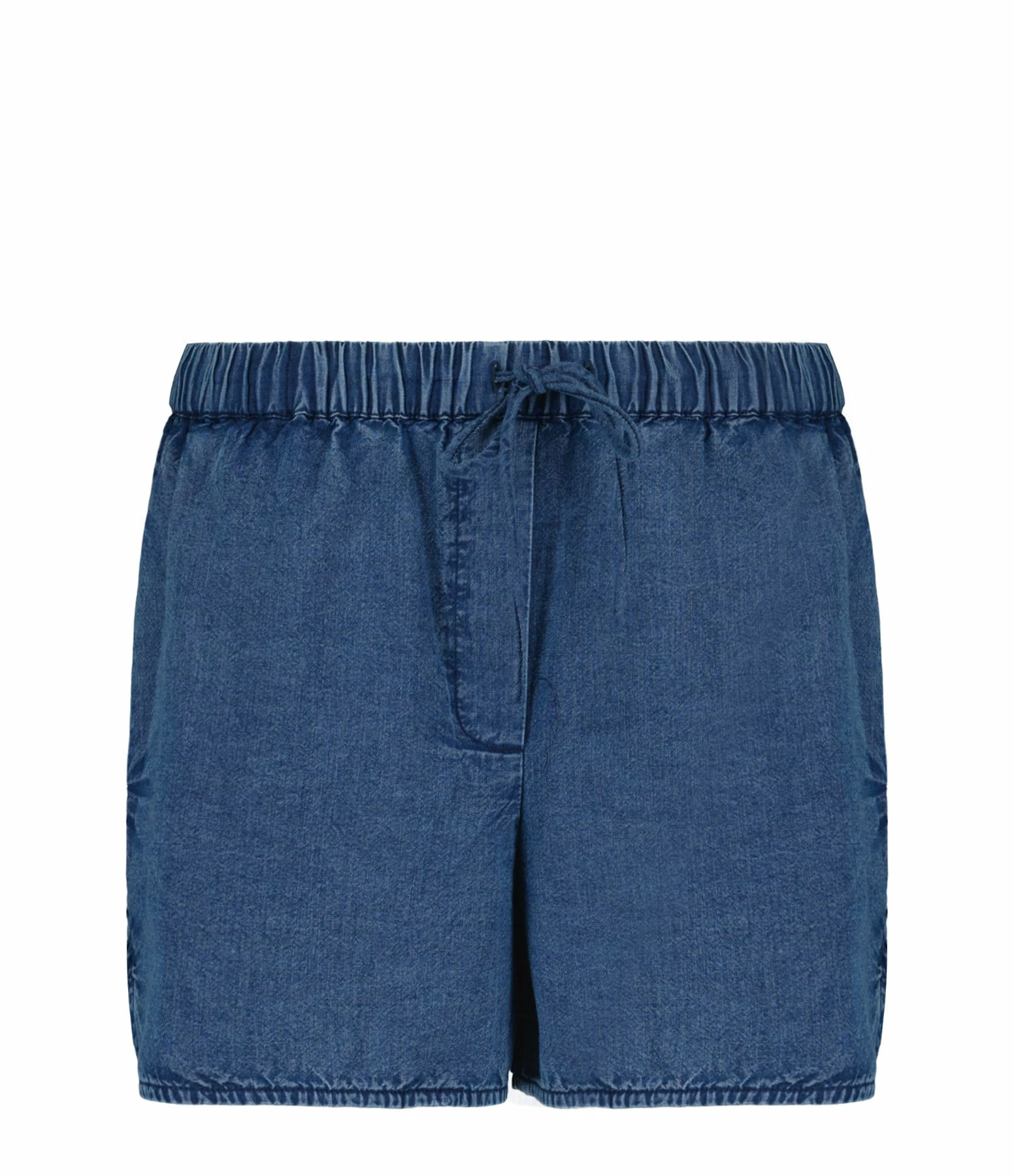 Petit short en denim souple, élastiqué à la taille avec lien de serrage. Bas de jambe arrondi. Deux poches fendues dans les coutures de côté.