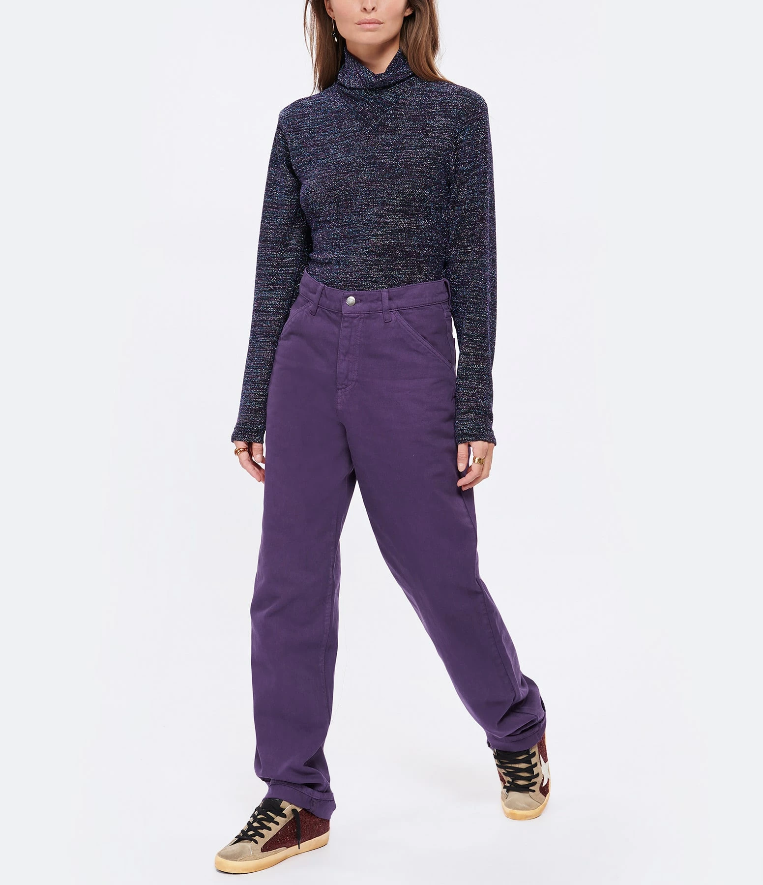 Pantalon en denim de coton violet. Taille marquée avec passants pour ceinture. Fermeture zippée sous la braguette et boutonnée sur le devant. Bouton en métal argent. Deux poches italiennes. Deux poches plaquées dans le dos. Coupe droite. Base droite.