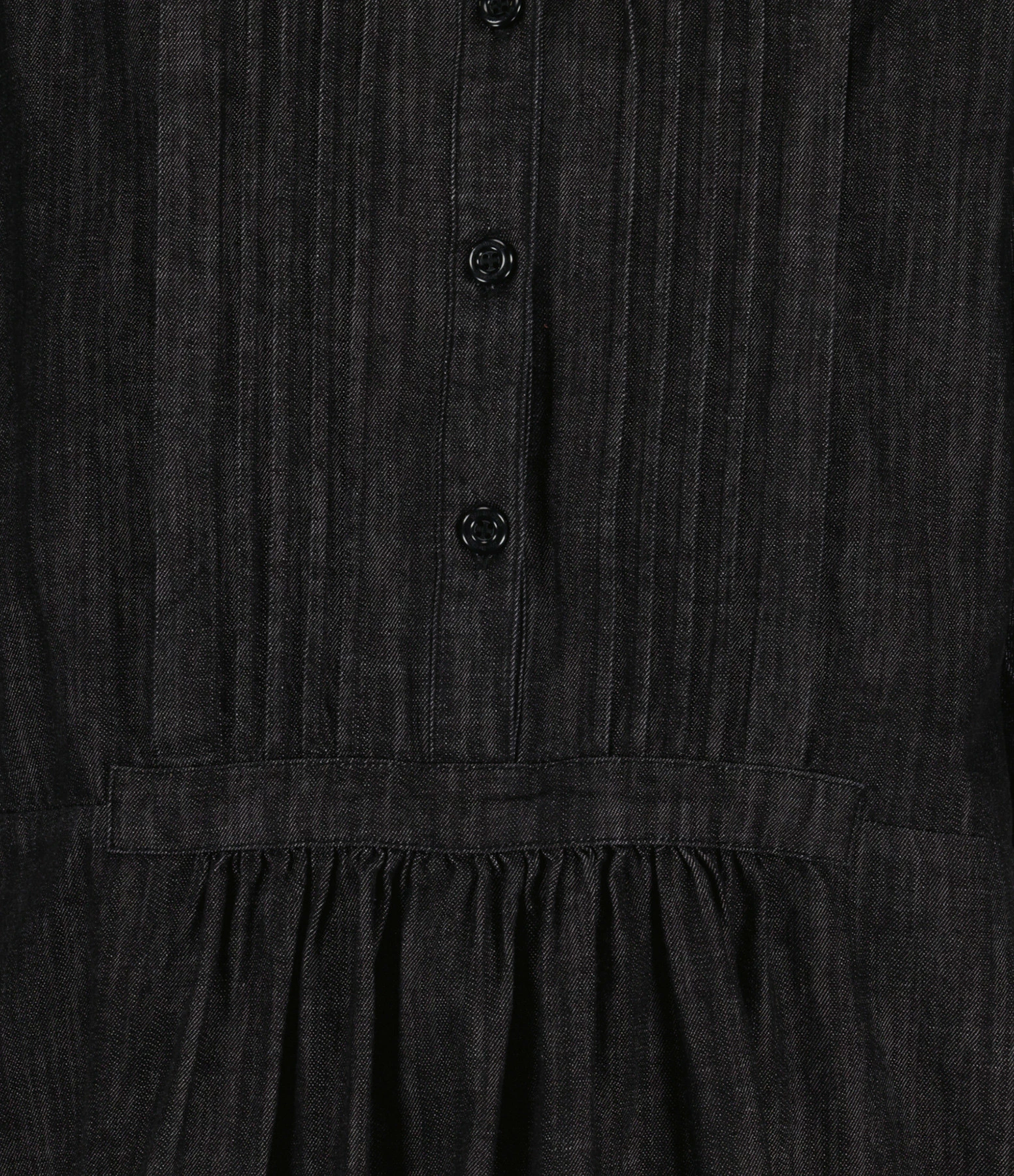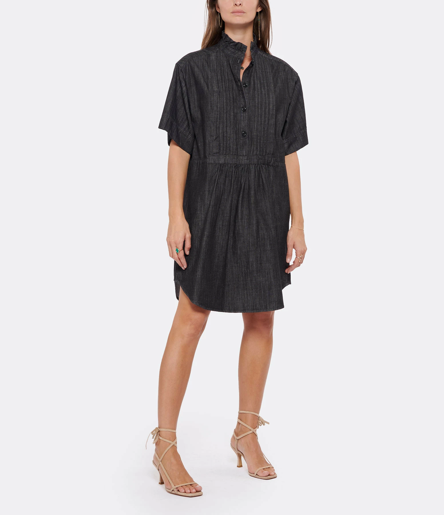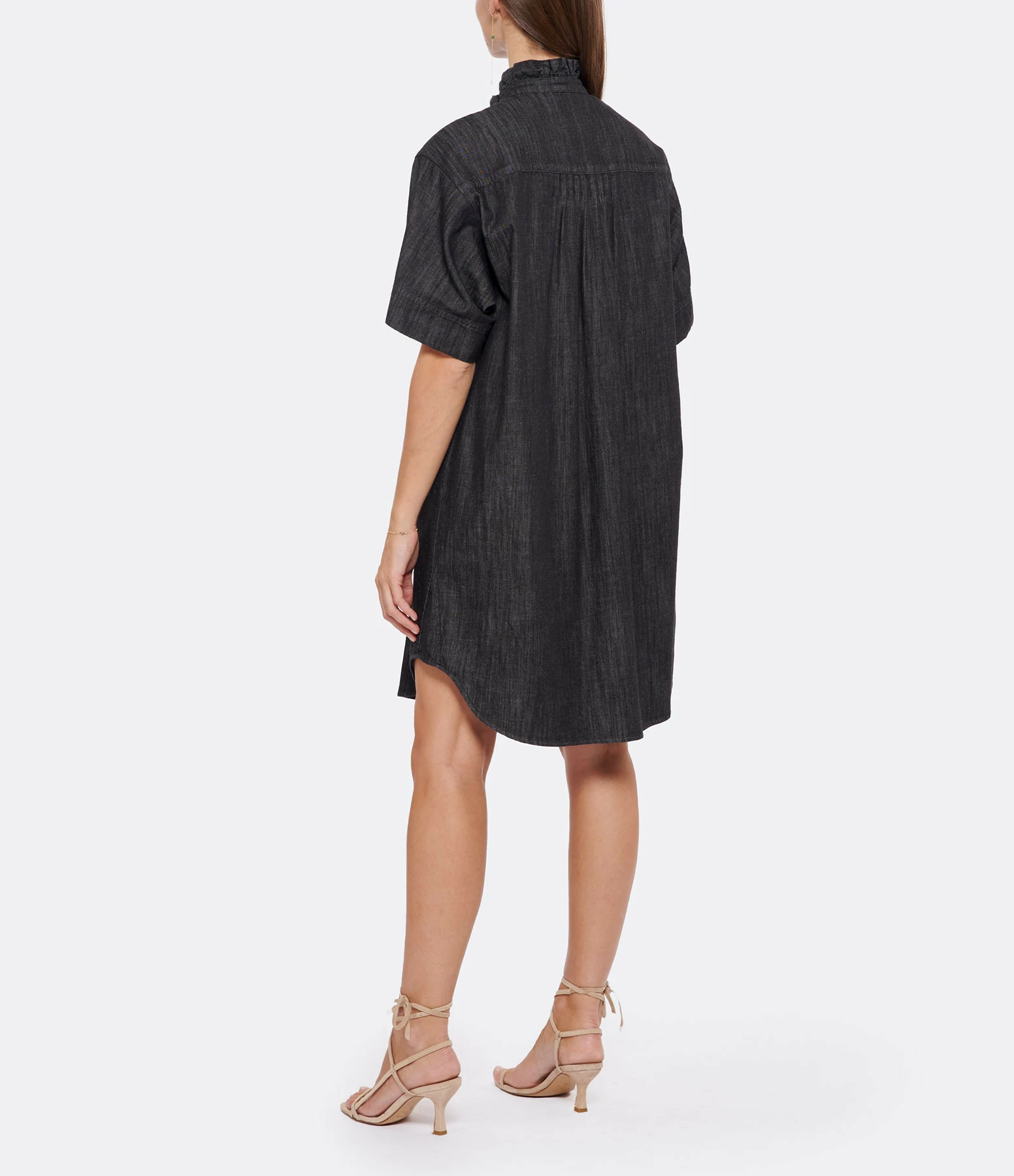 Robe courte en denim noir. Col avec volants Manches courtes. Fermeture par boutons à l’avant. Coupe évasé. Base arrondie plus longue à l’arrière.