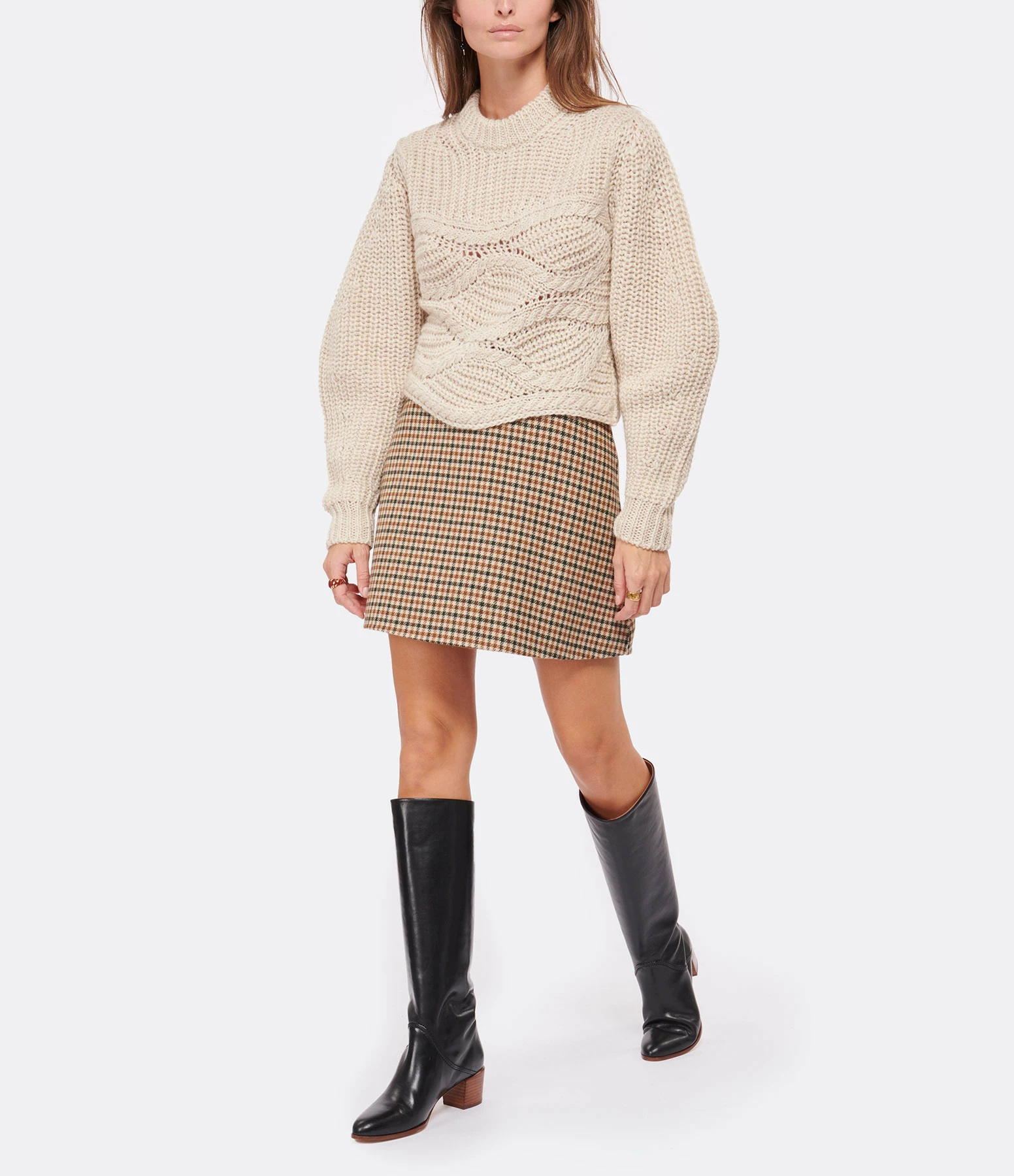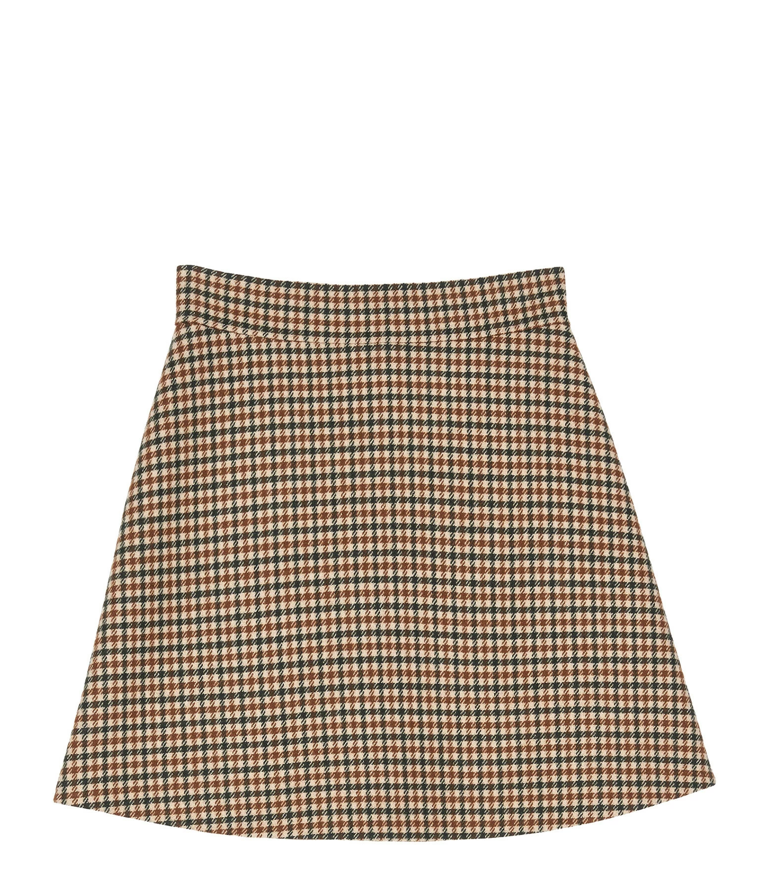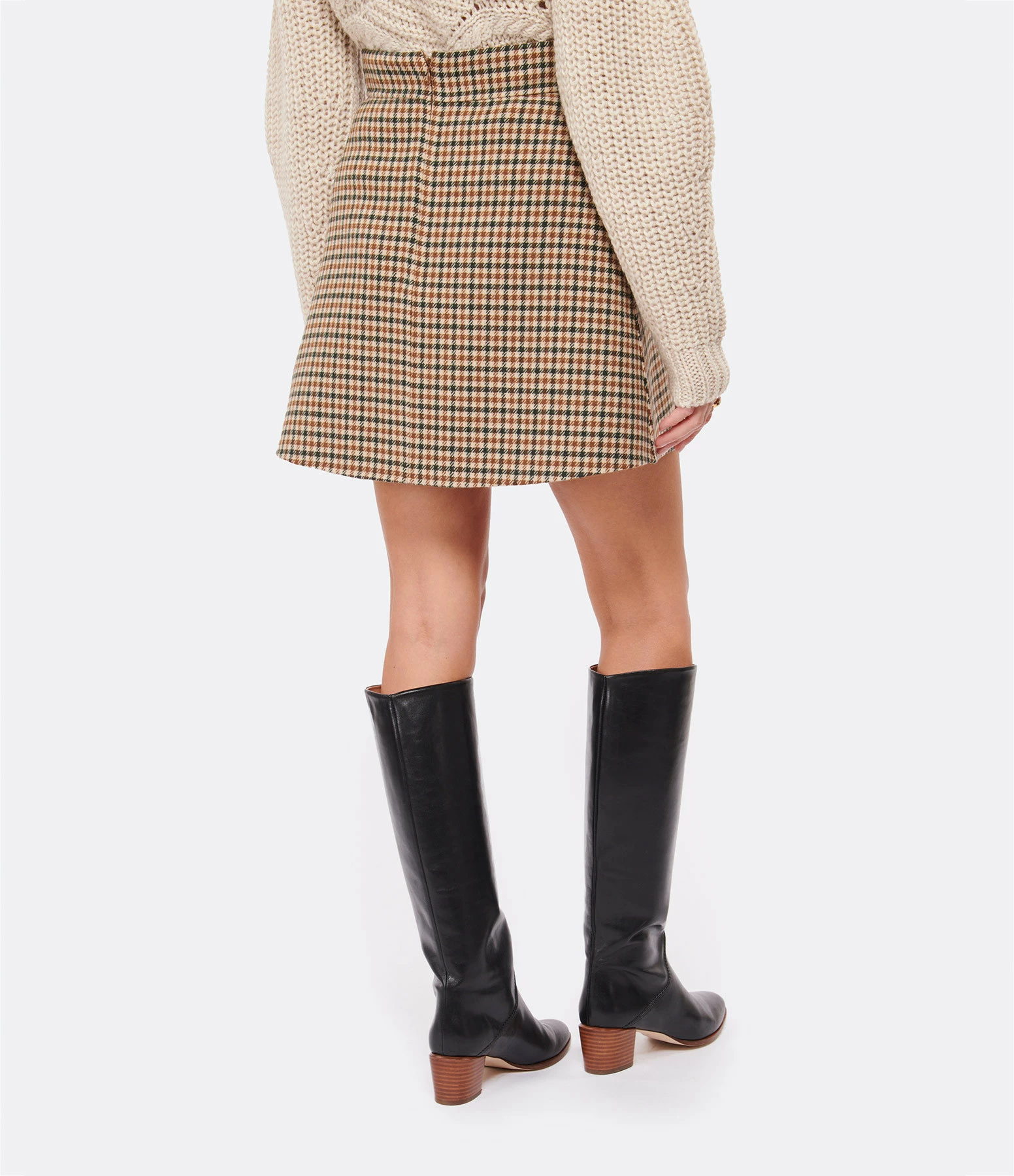 Jupe courte en laine imprimé pied de poule beige et marron. Coupe trapèze. Fermeture par zip au dos.