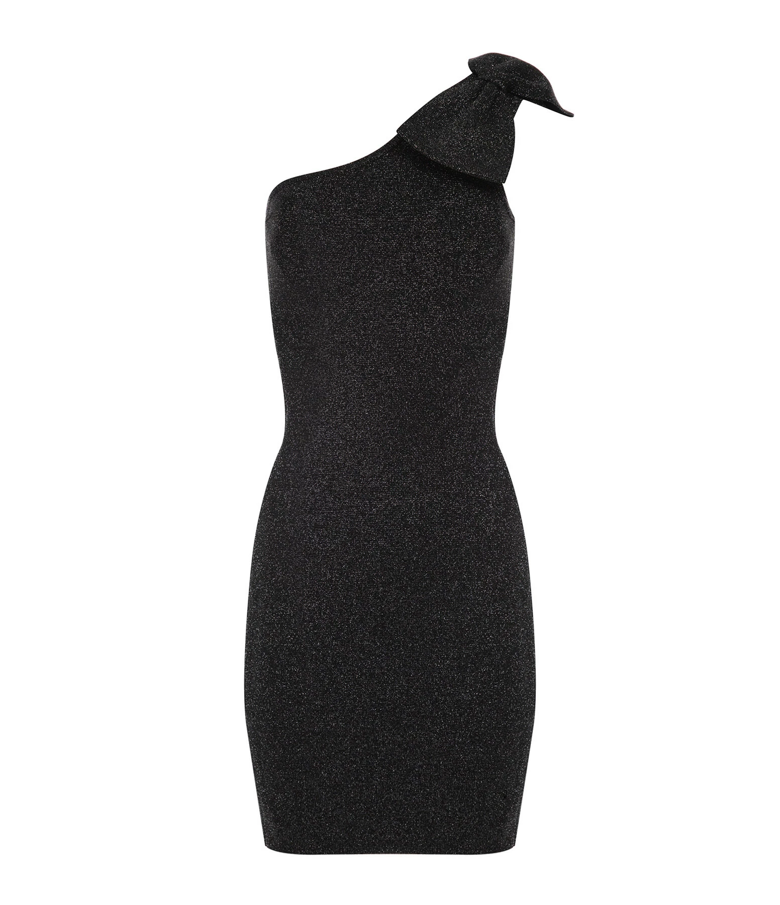 Robe courte en maille noire ornée de fils métallisés argentés. Encolure asymétrique décorée d’un gros nœud sur l’épaule gauche. Sans manches. Coupe près du corps. Base droite.