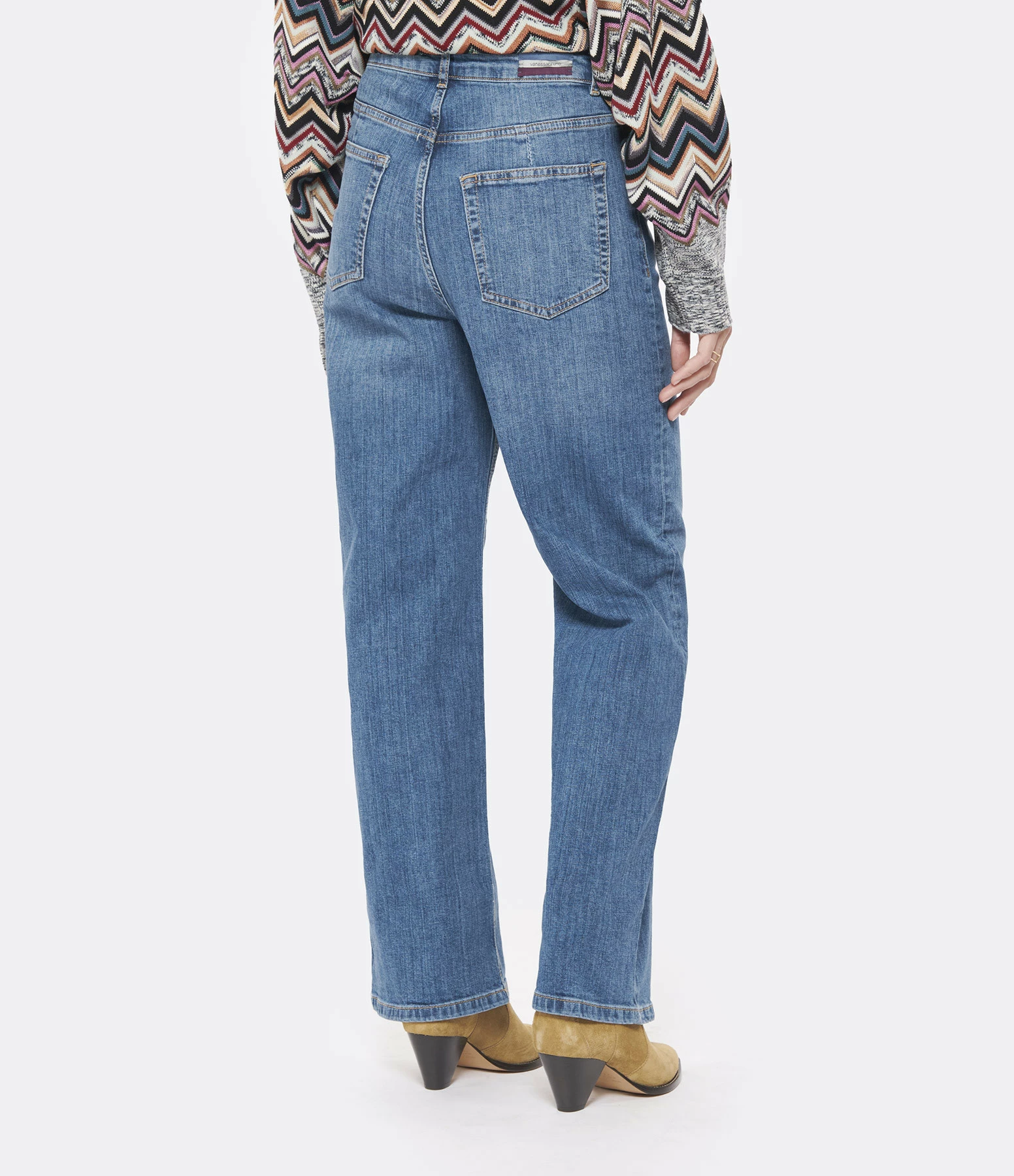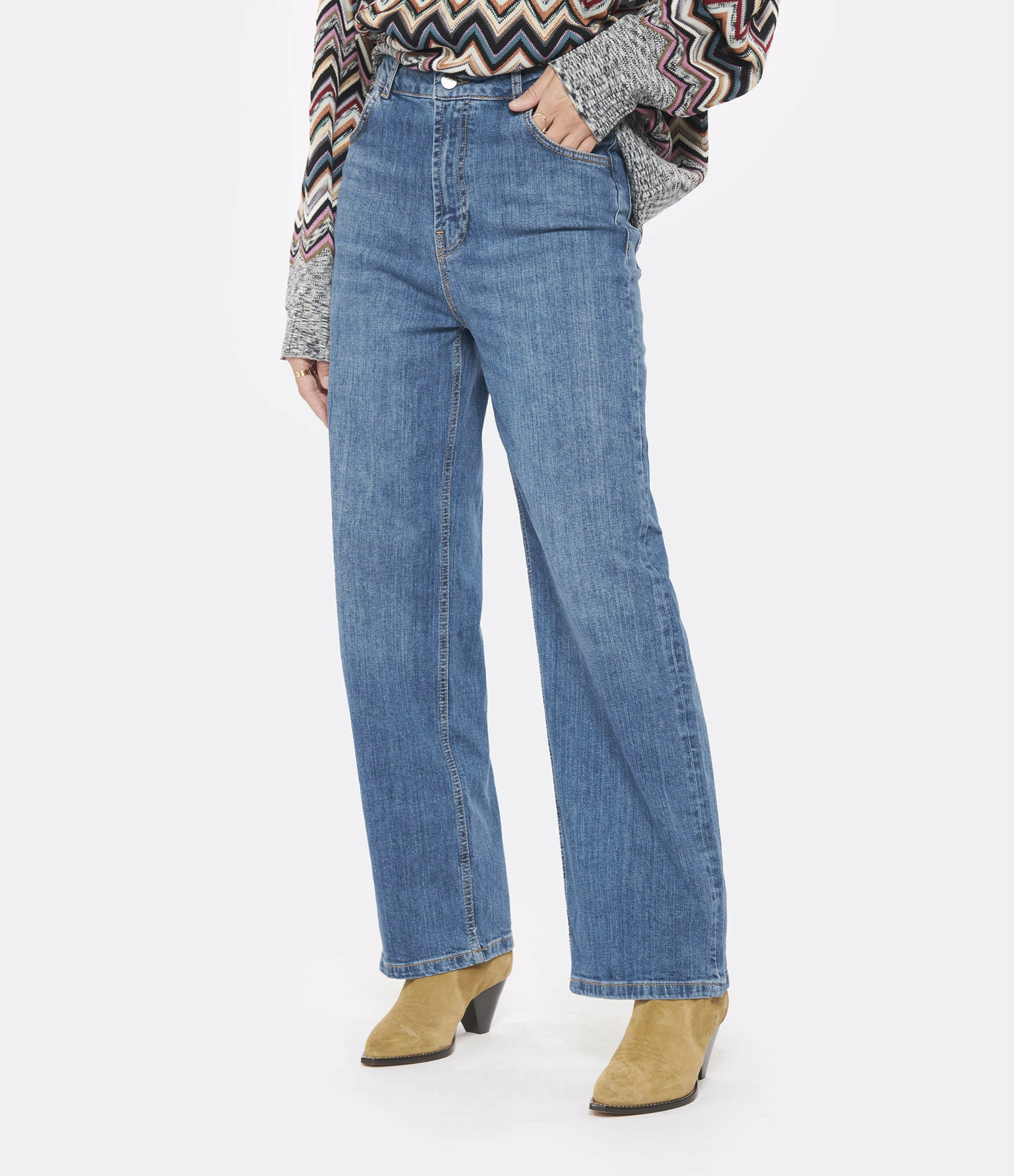 Jean droit en coton bleu. Taille haute avec passant pour ceinture. Fermeture par zip et boutons. Cinq poches. Coupe droite.