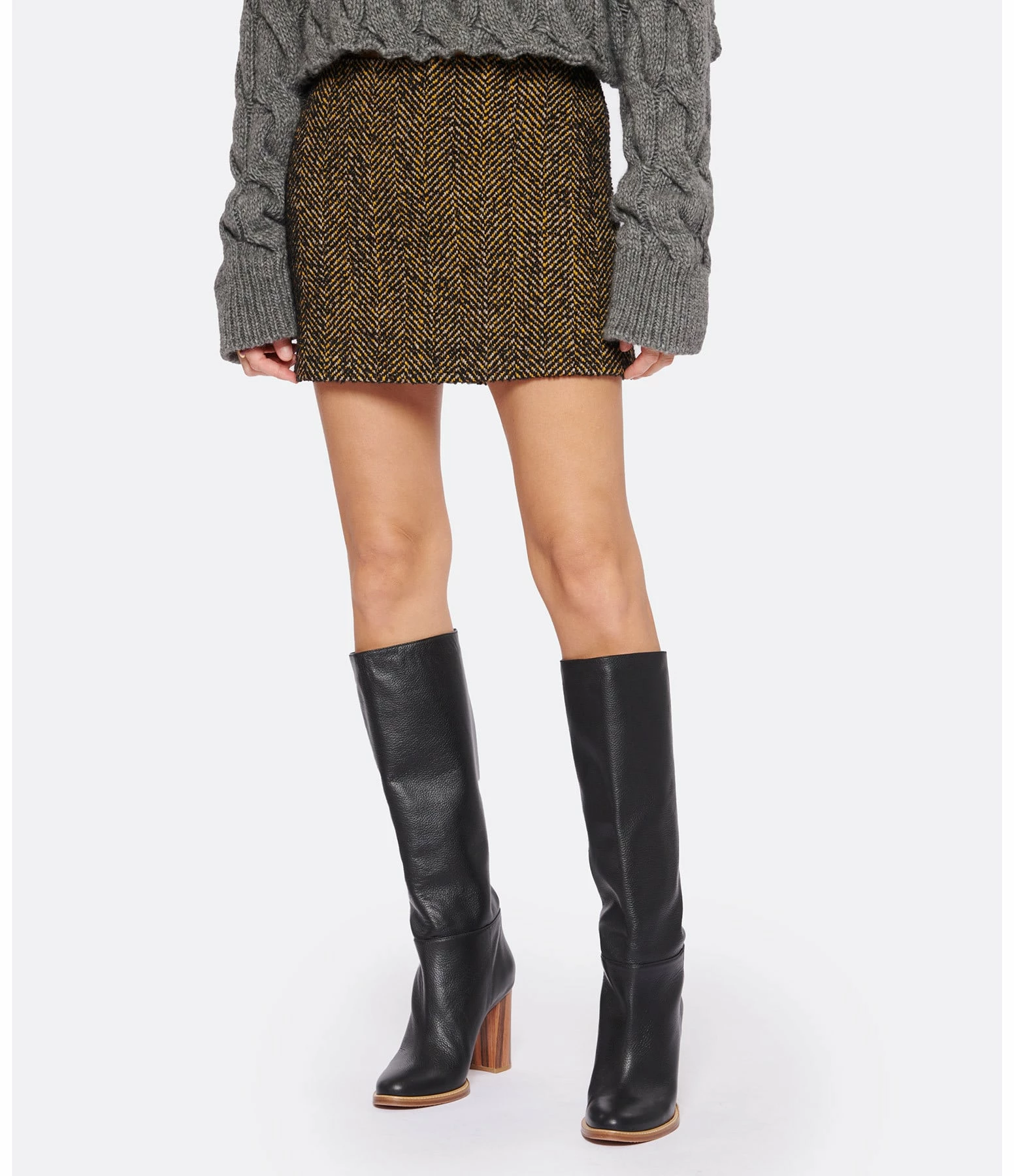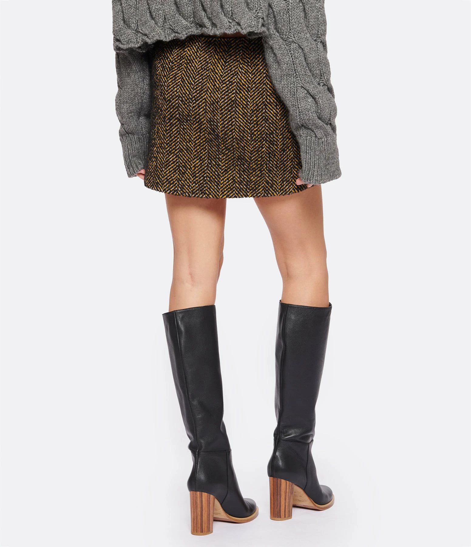 Jupe courte en laine mélangée à motifs chevrons noir et marron. Fermeture zippée invisible latérale. Coupe près du corps. Base droite. Doublée.