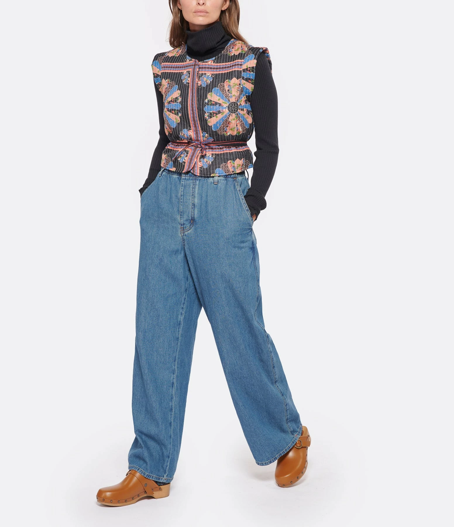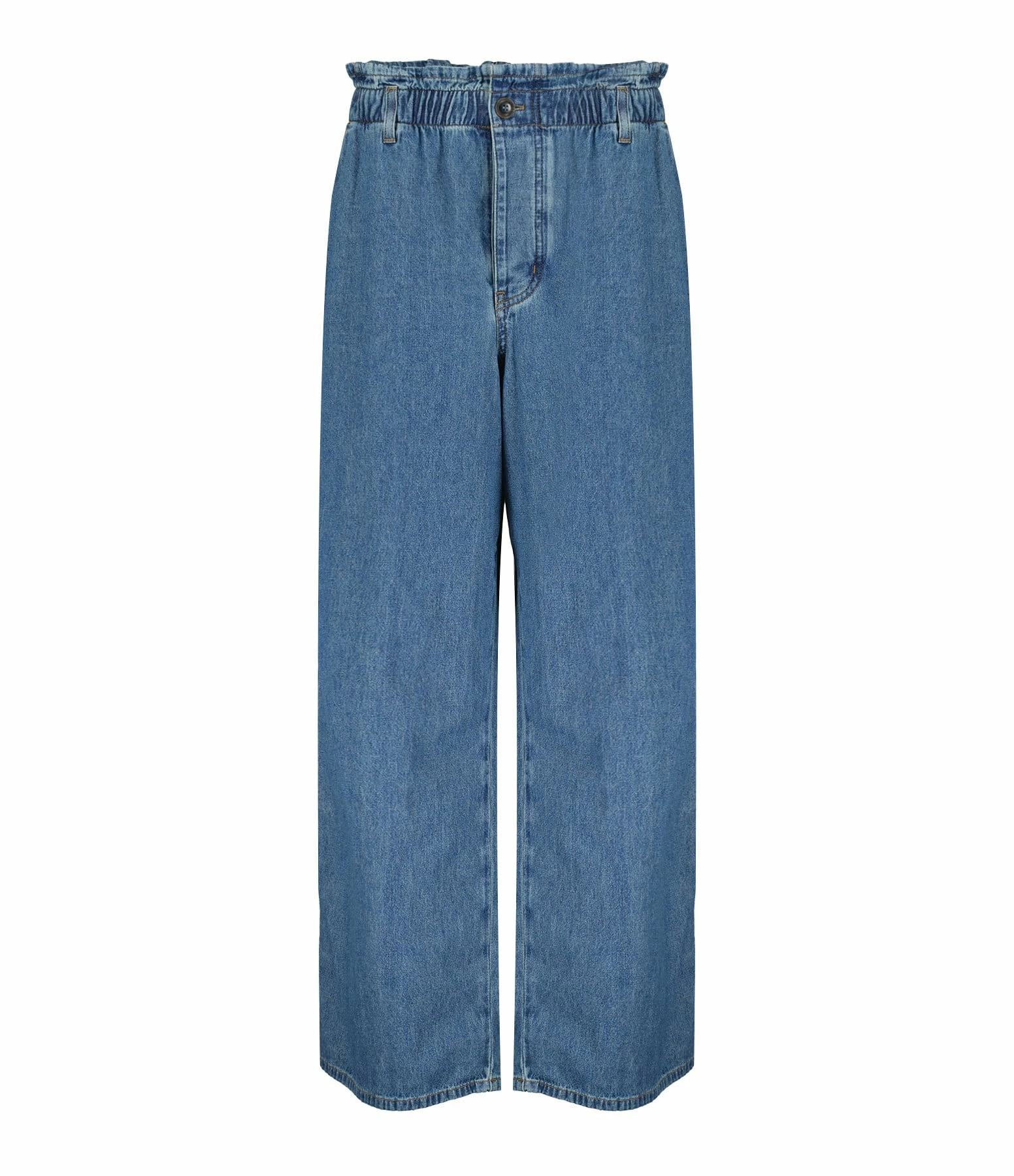 Pantalon en denim de coton bleu. Taille élastiquée et froncée avec passants pour ceinture. Fermeture boutonnée sur le devant. Boutons marron effet corne. Deux poches italiennes sur le devant. Deux poches plaquées dans le dos. Coupe large. Base droite.