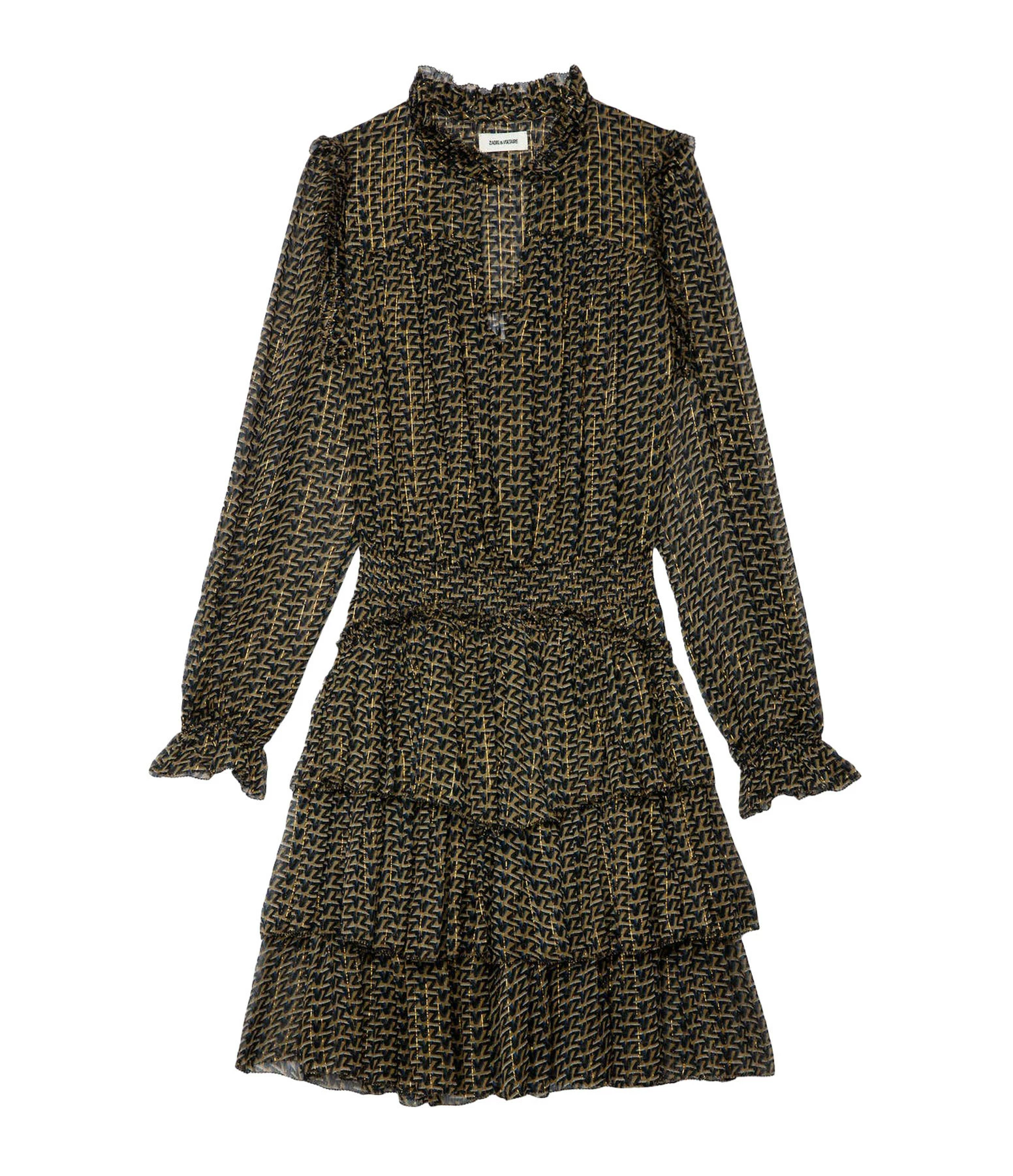 Robe courte kaki à volants imprimée d’un monogramme ZV en all over et réhaussée de fils métallisés. Manches longues avec poignets smockés ornés de volants. Encolure en V volantée autour du col. Taille smockée. Jupe drapée. Coupe buste loose. Coupe jupe légèrement évasée. Base droite à bords frangés. Doublée.