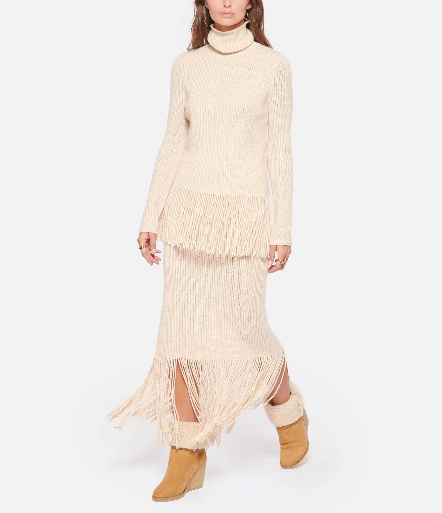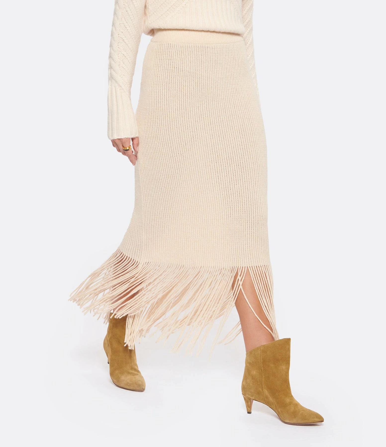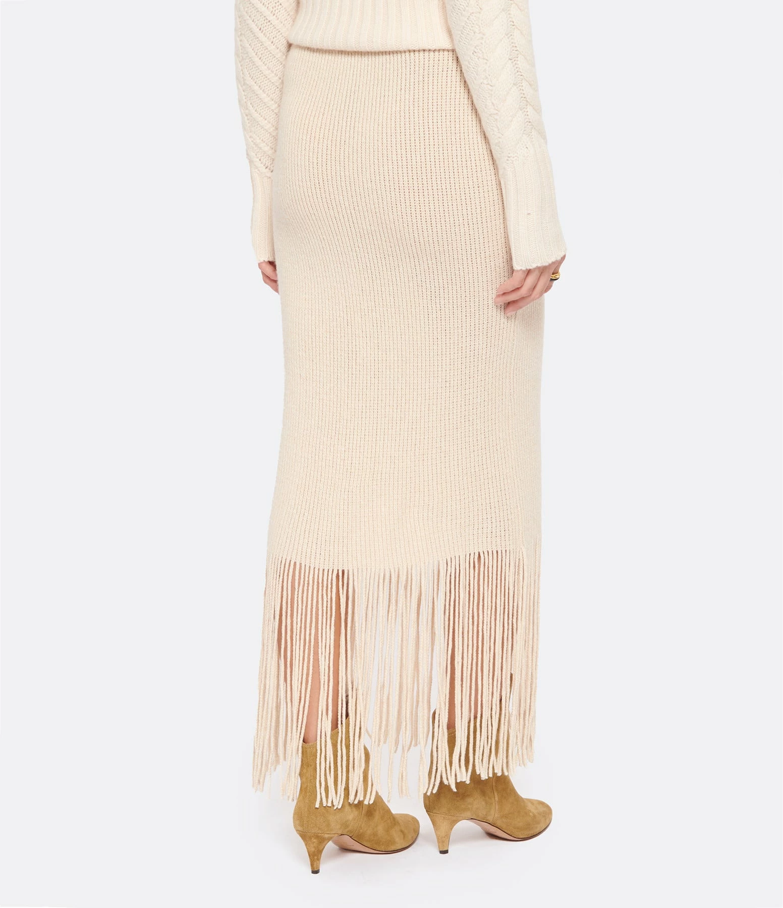 Jupe mi-longue en maille côtelée de laine et cachemire ivoire. Taille haute élastiquée. Coupe crayon. Base droite frangée.